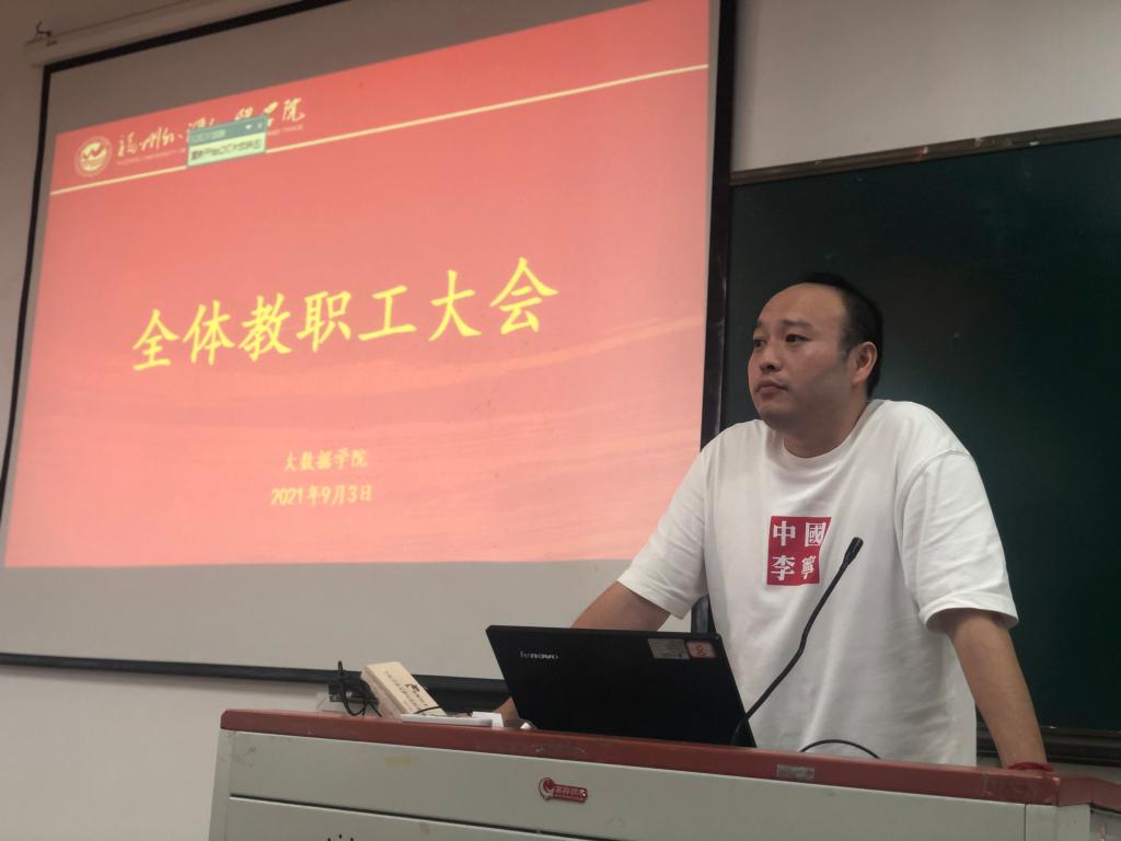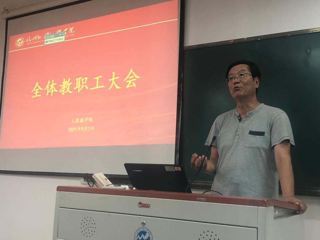 启航新征程 砥砺谋新篇┃大数据学院召开2021年秋季新学期全体教工大会 新起点、新格局、新形势、新征程。9月3日下午,我院在教5309召开新学期全体教职工大会,对学院新学期重点工作进行部署,本次会议由院长宁正元主持。 会议上,办公室主任陈曦对学院2021年度教职工考核及业绩绩效工资分配方案做了详细说明和解读;副院长叶福兰从暑期重点工作回顾、新学期教学重点工作、新学期教学工作要点和教学注意事项四个方面进行强调和部署;分党委书记、副院长陈宏伟介绍了我院2021年招生情况并对新学期新老生返校报到、新生入学安排、疫情防控工作、培养成效等方面做了重要部署;副院长谢亚君从科研工作方面跟老师们分享了他的心得并鼓励老师们积极参与科研工作,开拓进取,不断提高我院科研水平。 最后,院长宁正元结合学校最新的行政机构调整,向老师们公布院领导的分工和学院党政联席会议、院务会议及几个分委员会的人员组成。并从人才培养、一流专业建设、学科发展、师资队伍建设等方面全面阐述了大数据学院的办学思路以及未来学院的发展形势。 风劲潮涌自当扬帆破浪,任重道远更需策马扬鞭。新学期的号角已经吹响,本次大会为新学期各项工作指明了方向,学院凝聚了共识,明确了方向,相信在全体教职工的共同努力下,学院必将朝着更高、更强、更优的目标迈进。 大数据学院办公室 2021年9月6日