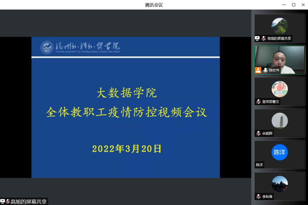 3月20日晚19时,大数据学院通过腾讯会议召开学院疫情防控视频会议,学院全体教职工在线参会。会议伊始,我院副院长陈宏伟书记分析了近期福建疫情的严峻形势,结合省市及学校领导要求,对我院防疫工作进行以下说明:一、要认真贯彻落实学校疫情防控精神及文件要求,认真执行,责任到人。二、严格实行入校和出校的审批程序。三、按要求认真做好核酸检测工作,做到应检尽检。四、加强健康排查,做到数据精准,全体师生要如实填写今日校园,做到责任到人。五、有问题及时沟通、反馈,不得瞒报、漏报。师生一旦有黄码、红码的情况,以及接到疾控中心的通知作为密接、次密接时,必须第一时间联系所属领导或辅导员。六、强化责任意识,要未雨绸缪,密切关注疫情变化,动态调整防控预案,做好疫情防控各项应急准备工作。七、强化组织纪律,加强舆情管控,教育引导师生及时关注官方发布的权威信息,不恐慌、不信谣、不传谣,主动配合落实各项疫情防控措施。八、强化服务意识,深入一线,引导师生做好自我防护,做好心理疏导,加强防控督查。