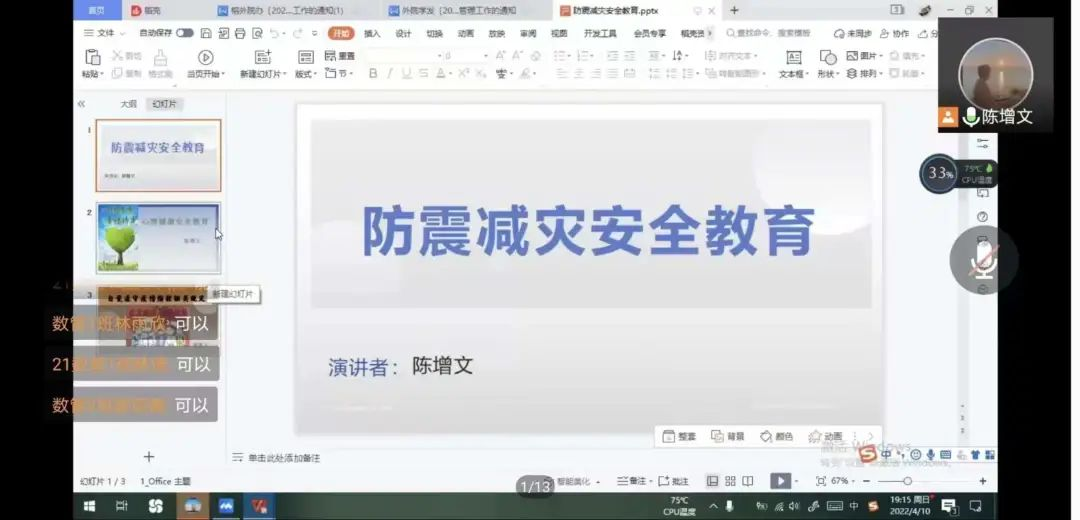 为增强学生的安全意识,普及推广学生防震减灾知识和避灾自救技能,使学生在遇到地震等突发事件时能有秩序地逃生自救。我院辅导员以班级为单位,进行线上线下相结合的形式组织开展了“防震减灾”安全教育主题班会。