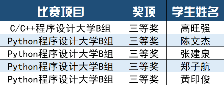 近日,第十三届蓝桥杯全国软件和信息技术专业人才大赛福建赛区比赛落下帷幕。我校大数据学院高旺强、陈文杰、张建泉、郑子航、黄印俊5位同学在指导老师郑隐馨的带领下与省内其他高校精英同台竞技。经过激烈比拼,高旺强获得了C/C++程序设计大学B组三等奖,陈文杰、张建泉、郑子航、黄印俊获得了Python程序设计大学B组三等奖。