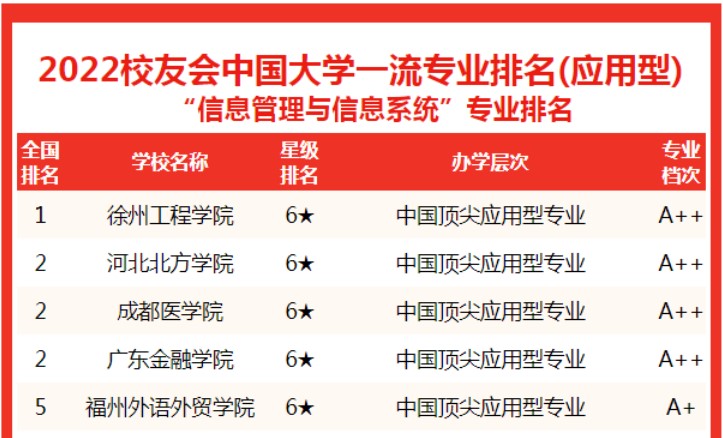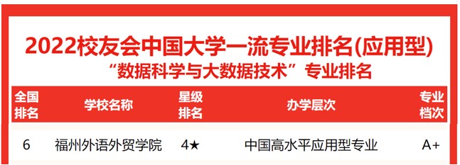 日前,全国第三方大学评价机构艾瑞深校友会网(Cuaa.Net)最新发布2022校友会中国一流专业排名、2022福建省一流专业排名和2022福建省各学科门类一流专业排名。在一流专业排行榜中,我院信息管理与信息系统、电子商务专业入选六星级中国一流应用型专业,均位列全国应用型高校第五、福建省第一;数据科学与大数据技术专业入选四星级中国一流应用型专业,位列全国应用型高校第六、福建省第一。