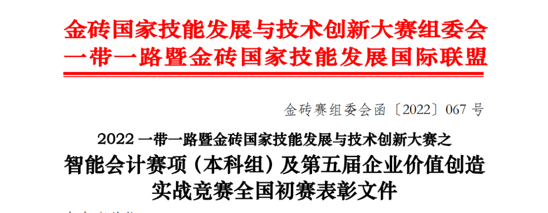 喜报!我院学子在金砖国家技能发展技术创新大赛中荣获省一等奖,取寻国赛资格! 近日,我院2019级数据科学与大数据技术专业2班叶欣同学与财金学院同学一起参加的金砖国家技能发展和技术创新大赛智能会计方向省赛,荣获一等奖,取得国赛资格,福建省高校只有福建工程学院与我校2所入围! 本赛事自4月份学校发文组织学生校赛预选以来,我院教师甘智平与财金学院老师联合申报,组织大数据学院与财金学院相关专业学生报名集训一个月,优选出一支队伍参加省赛,获得一等奖!体现出我校师生日常紧紧围绕“一流高校应用型人才培养”所取得的成效! 据悉,金砖国家技能发展和技术创新大赛是由金砖国家工商理事会、一带一路暨金砖国家技能发展国际联盟、中国科协一带一路暨金砖国家技能发展与技术创新培训中 心主办,中国发明协会、教育部中外人文交流中心联合主办,金砖国家工商理事会技能发展工作组承办。 本赛事是2017年金砖国家最高领导人会晤筹备委员会认可、在中华人民共和国外交部备案、金砖国家工商理事会批准的国际大赛,自2017年起,金砖大赛连续五年在《金砖国家工商理事会工作报告》中作为成果设计呈送给金砖五国最高领导人。 希望我院学子能始终保持争当一流“数字服务工匠”的学习干劲,在各类学科竞赛中争创佳绩! 大数据学院办公室 2022年05月29日