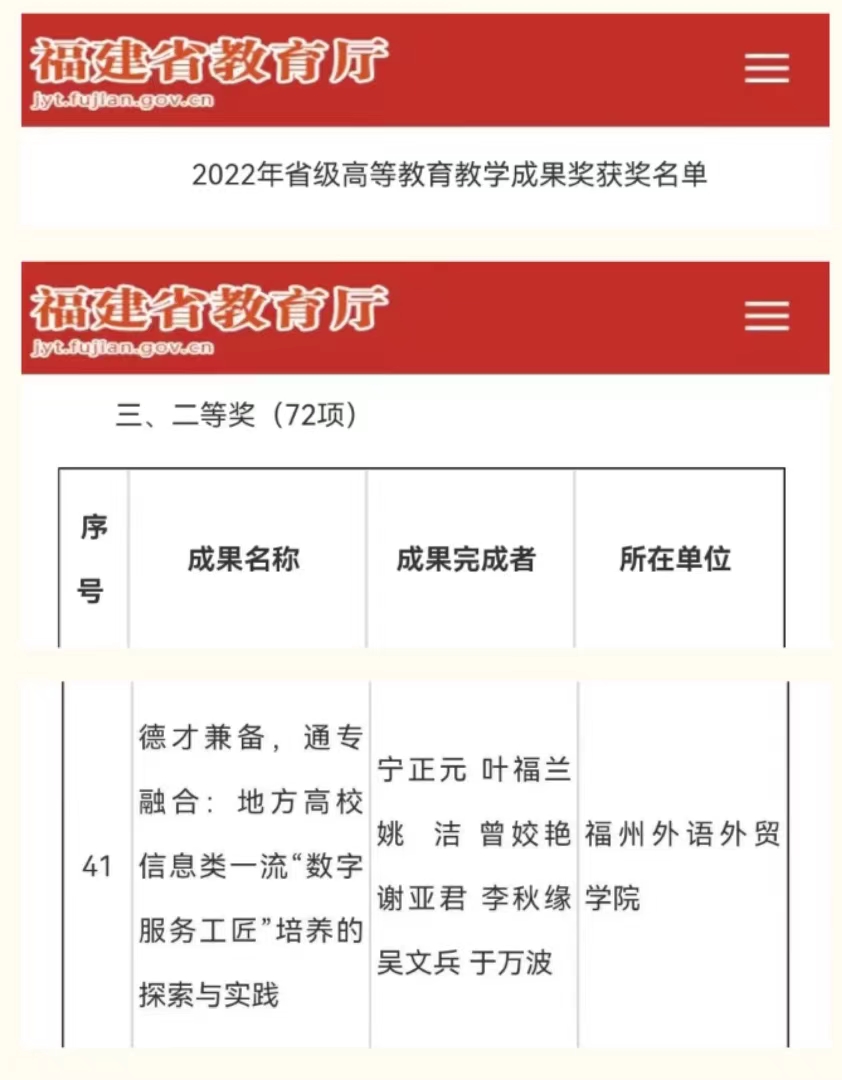 日前,福建省教育厅印发《关于公布2022年省级教学成果奖获奖成果的通知》,由我院宁正元、叶福兰、姚洁、曾姣艳、谢亚君、李秋缘、吴文兵、于万波等老师完成的《德才兼备,通专融合:地方高校信息类一流“数字服务工匠”培养的探索与实践》荣获福建省高等教育省级教学成果奖二等奖。