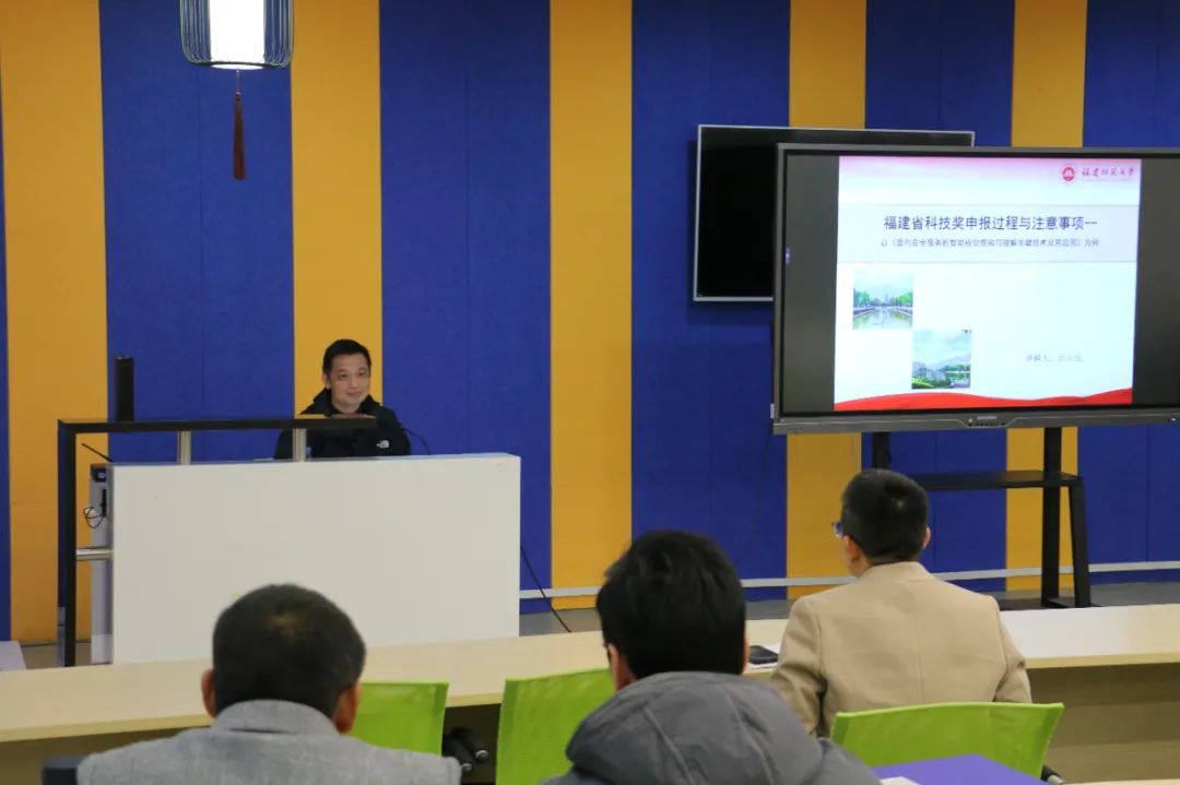 讲座上,黄添强教授主要围绕福建省科学技术奖简介、提名要求及有关规定的解读、省科学技术进步奖申报流程、福建省科学技术进步奖提名书的填写四个方面对各类科技奖申报进行了详细的指导。他还以个人申报经历为例,介绍了福建省科技奖的申报过程及撰写申报书的注意事项,向大家传授省科技奖申报的经验。他还对省科技奖的专家提名和单位提名进行了分析,重点阐述了省科技奖提名书的科技创新和应用与效益部分内容的填写。并提倡提名书要细细打磨,精雕细琢,力求完美。