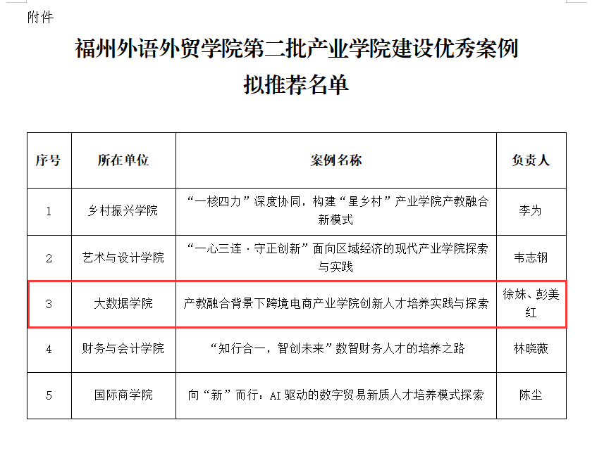 【喜报】我院优秀案例成功入选学校第二批产业学院建设优秀案例拟推荐名单 近日,开元网站登录入口教学发展中心公布关于第二批产业学院建设优秀案例的评选结果,我院徐妹老师和彭美红老师凭借《产教融合背景下跨境电商产业学院创新人才培养实践与探索》这一案例成功入选此次拟推荐名单。 此次入选的优秀案例,充分展现了我院在电商产学研融合、人才培养模式革新等方面的突出成果。展望未来,我院将持续深化校企合作关系,完善电商课程体系,促进产学研深度融合发展,助力学生增强实战能力与创新意识,为区域电商产业的高质量发展贡献更大力量。 大数据学院办公室 2025年3月22日