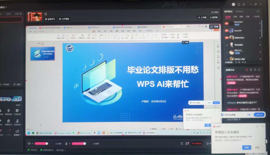 为深化“人工智能+”教育战略,推动学术写作数字化转型,近日,我院信息管理与信息系统系副主任卢承财老师在哔哩哔哩平台举办了一场主题为“毕业论文排版不用愁:WPS AI来帮忙”的专题培训。信息管理与信息系统系全体毕业生参加。