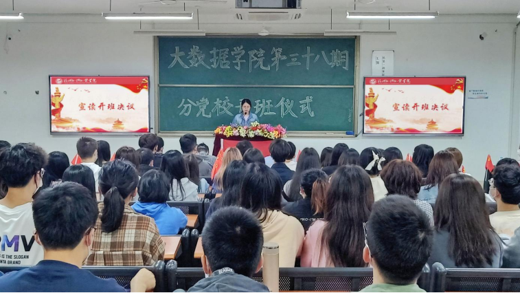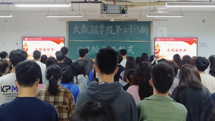 【党建动态】大数据学院分党校第三十八期培训班开班仪式顺利召开 为进一步夯实提升我院积极分子理论修养与综合素质,营造我院积极学习党的理论、方针和政策的良好氛围,重温党的百年奋斗历程,以更好成绩喜迎二十大的召开,经校党委批准,大数据学院分党委于2022年4月29日下午18:30在教5203举办第三十八期分党校开班仪式。出席本次仪式有大数据学院分党委书记、分党校校长、学院副院长陈宏伟副教授,分党委委员杨兴鑫同志,学生各支部委员黄椤茜、郑隐馨及培训班的全体学员。此次仪式由学生第一党支部书记潘云燕同志主持。 一、奏唱国歌 大会第一项,全体起立,奏唱国歌。各学员以庄严的神情和雄壮而宏亮的国歌声表达出了自己坚定不移加入中国共产党的决心。 奏唱国歌 二、宣读开班决议 大会第二项,由党校负责老师潘云燕同志宣读本次开班决议,决议中指出本次党校培训的上课以及考核方式,通过培训,入党积极分子不仅要通过理论教育、党性教育坚定的政治信仰,更要在实践中不断总结,不断进步,理论联系实际。希望同学们坚持理想信念,坚持勤奋学习,坚持党的根本宗旨,坚持勤奋工作,坚持遵守党的纪律。 潘云燕同志宣读开班决议 三、学员代表发言 大会第三项,由学员代表李玲发言,她表示:“我们要珍惜在党校学习的宝贵机会,要努力做到:端正学习态度,积极主动学习,上课认真听讲,做好学习笔记,完成培训作业,要以高度的自觉性和自律性严格要求自己,通过本次党校学习,努力提升理论修养和政治觉悟,争取早日加入党组织,做与新时代同向同行的优秀新青年。” 学员代表李玲发言 四、大数据学院分党委书记、副院长、分党校校长陈宏伟同志讲话 大会第四项,由大数据学院分党委书记、副院长、分党校校长陈宏伟同志发表讲话,首先,陈宏伟书记对参加本期培训班的各位同学表示热烈的欢迎和衷心的祝贺。随后他提到:在中国共青团迎来成立100周年之际,在五四青年节即将到来之际,习近平总书记考察中国人民大学并同师生代表亲切座谈,对当代青年提出殷切期望和明确要求,在考察调研中,总书记勉励全国广大青年,牢记党的教诲,立志民族复兴,不负韶华,不负时代,不负人民,在青春的赛道上奋力奔跑,争取跑出当代青年的最好成绩。 陈宏伟同志讲话 他对本次培训班学员提出三点殷切希望: 第一,在学习中提高站位。 学可以明智,习可以增慧。我们的党是学习型政党只有不断学习,才能永葆与时俱进的动力,经久不衰的生命力。陈宏伟书记要求各青年学生一方面要加强政治理论的学习,另一方面要加强专业知识的学习,前者是方向,后者是基础。必须加强对党的理论知识的学习,以此来提高思想政治素质,提高站位,加强党性修养树立坚定的信念和崇高的理想。 第二,在奋斗中担当使命。 陈宏伟书记指出,作为一名积极向党组织靠拢的青年学子,作为一个要为实现中华民族伟大复兴的中国梦而奋斗的青年人,必须坚持做到立大志,明大德,成大才、担大任,努力将个人奋斗融入党和人民的事业中。 第三,在实践中争做先锋。 陈宏伟书记强调,入党不能只停留口号上,停留在纸上,停留在思想上,更要体现在实践中,在实践中严格对照党员条件,从严要求自己,努力全面发展,以自己的实际行动接受党的考验,在实践中争做先锋。 五、奏唱国际歌 大会第五项,全体起立,奏唱国际歌。在庄严的歌声中开班仪式圆满结束。 奏唱国际歌 本次开班仪式的顺利召开,开启了我院2022年学习党的理论知识的新篇章,同时为我院学生讲授了一堂生动的思政大课,进一步引导教育我院学生端正入党动机,努力做到坚定信念、志存高远、认真学习、脚踏实地,让青春在为祖国和人民的不懈奋斗中绽放出绚丽之花。