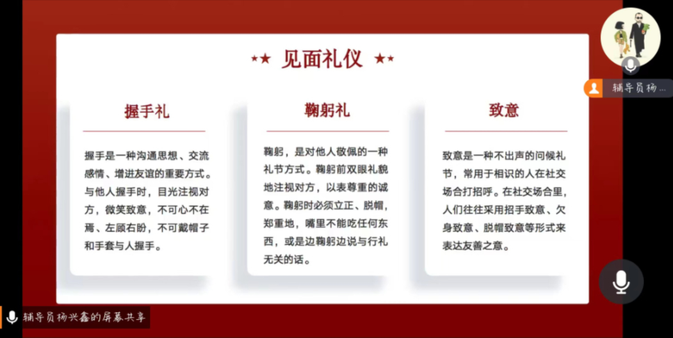 学生第二党支部书记杨兴鑫同志指出,礼仪礼节是道德素养的体现,也是社会不变的底色。党员们要以身作则,遵守传统礼仪礼节,积极传承和弘扬中华传统文化,更好地履行党员责任,促进全社会的文明素质提升,推动社会和谐发展。