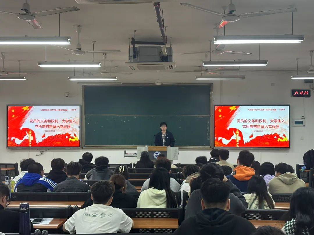 2023年11月14日下午13:50,翁君喆老师在教5102开展了以“党员的义务和权利、大学生入党所需材料及入党程序”为主题的党校培训,旨在带领全体学员深入理解党员的权利和义务,了解入党流程和党组织基本结构,要求学员们认真领会其深刻内涵,把握其精神实质。