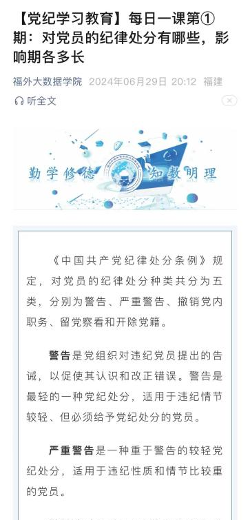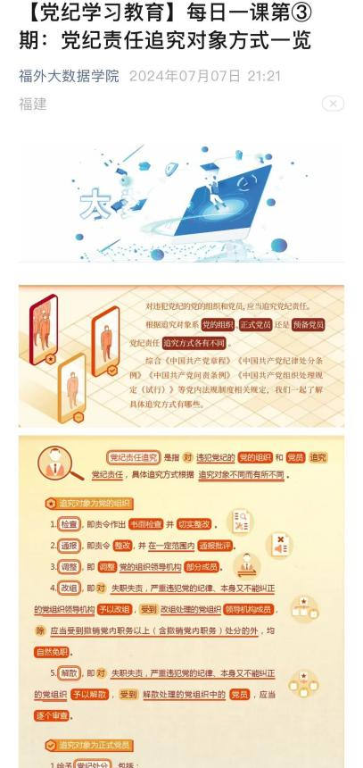 线上线下共同推进党纪学习教育。为促使其深刻认识政治纪律和政治规矩的重要性。创新学习形式,借助新媒体平台,同步推送党纪知识要点,以图文等形式进行详细解读,扩大学习覆盖面,确保党纪教育入脑入心,全方位提升党员纪律素养,相关学习推文40余篇。