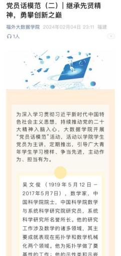 【全力拼搏迎挑战,砥砺奋进谱新篇】大数据学院2024年党建工作回顾 2024年是持续推进党的二十大战略部署深入实施的关键之年,是在新时代新征程上破浪前行、争创新绩的奋进之年。今年大数据学院分党委持续以习近平新时代中国特色社会主义思想凝心铸魂,深入贯彻落实党的二十大精神、二十届三中全会精神,不断强化“四个意识”、坚定“四个自信”、做到“两个维护”。全力推动学院党建工作在新的一年里向更高目标攀升、向更深层次迈进、向更广领域拓展,为学校审核评估、申硕工作及学院高质量发展提供坚实保障,奋力书写学院党建工作新篇章。 筑牢发展根基,精耕党员培育 推动党员发展工作迈向新高度。严格遵循发展党员工作条例要求,在入口处以高标准、严要求把控质量关卡。2024年度大数据学院分党委新发展党员108人,按期转正40人,完成党员转出110人,党员转入25人。 以人为本,德育为先。深入贯彻党的二十大对发展党员工作提出的新要求、新方向,推动党员发展工作高质量前行。今年,大数据学院分党委已培养积极分子211人,成功开展第43、44期党校培训。 强化政治建设,筑牢思想根基 坚持把学习贯彻新时代中国特色社会主义思想作为主线,先后组织开展理论集体学习50余场,参与学习人次达800余人。其中包括党纪学习教育6场,策划开展“传承红色基因,学思践悟精神谱系”系列主题党日活动2场,开展19场党校课程培训,并开展“三会一课”,进一步丰富党员的政治生活,提升党员的政治素养和理论水平,增强党组织的凝聚力与战斗力,确保党员在思想上、行动上与党中央保持高度一致,充分发挥党员的先锋模范作用。 开展10期“党员话模范”活动,活动以学生党员为主讲,定期推出。主要人物有:杨善洲、张富清、谷文昌同等。通过对榜样的事迹进行深入阐述,让广大青年学生认识到更多伟大且默默无闻的党员榜样。 线上线下共同推进党纪学习教育。为促使其深刻认识政治纪律和政治规矩的重要性。创新学习形式,借助新媒体平台,同步推送党纪知识要点,以图文等形式进行详细解读,扩大学习覆盖面,确保党纪教育入脑入心,全方位提升党员纪律素养,相关学习推文40余篇。 通过开展红色观影活动,以进一步引导广大师生共抒爱国情怀,共话时代新貌,不断增强历史责任感和使命感。 倡行志愿理念,孕育时代风采 夯实基层党组织服务根基,切实践行党的初心使命,多维发力服务师生群体。开展各项服务工作,以实际行动为广大师生排忧解难,将党组织的关怀与温暖传递至校园的每一处角落,有效增强了基层党组织的凝聚力与向心力。 秉持党员先锋模范精神,推动志愿服务迈向新台阶。踊跃投身于“志愿风采—平安、文明、有爱,这些志愿活动暖到心底”等各类特色志愿活动,累计服务人次超过1500余人,身体力行地传递温暖,在新时代的广阔舞台上,以实际行动续写爱国奉献的崭新篇章,让党员的担当与奉献成为时代浪潮中熠熠生辉的旗帜,引领社会风尚,汇聚奋进力量。 筑牢组织堡垒,提升组织效能 重视教师党员带头作用,发挥科学引领。我院三支教师团队在校第五届教师创新大赛中荣获佳绩,其中:高级组中荣获一等奖,课程思政组中荣获三等奖,产教融合组中荣获二等奖,学院还荣获了本次比赛的“优秀组织奖”。 我院教师撰写的案例入选全国高校电子商务与数字经济卓越案例库,同时入选福建省新工科教育优秀教学案例1个。我院还获批福建省自然科学基金项目5项、国家社会科学基金项目1项。 党团组织建设持续推进,筑牢基层党组织根基。通过举办“学习贯彻习近平新时代中国特色社会主义思想主题教育”活动暨第二届团歌大赛、“致青春,敬梦想-献礼福外二十周年”青春歌会、数智文化节等形式多样、内容丰富的文体活动,为学生搭建第二课堂的成长平台,激发其内在潜能,使其在参与中磨砺意志、提升能力,全方位展现数院学子积极昂扬、充满活力的精神风貌,塑造健康向上、富有朝气的新时代青年形象。 开展毕业生党员政治生日暨毕业前最后一堂党课,同时开展了“青春如火,岁月如炬”2024届毕业生党员寄语主题党日活动。这些活动能强化党员身份意识,在他们步入社会前巩固政治思想,传承党的精神。同时,他们把自己的信念、经验分享给其他党员,激励新党员成长,确保党的优良传统延续下去。 为深入学习贯彻习近平总书记的重要讲话精神,弘扬伟大建党精神,传承红色基因,激发爱国情怀,筑牢思想防线,今年大数据学院分党委组织开展“走进琴江满族村,共建民族团结路”、“祭奠英烈弘精神,赓续红色扬血脉”、“传承红色基因,学思践悟精神谱系”等主题党日活动,探寻那些闪耀着革命光辉的红色印记,感受那份历久弥新的精神力量。 为了切实发挥党建引领作用,凝聚共建合力,不断强化彼此间的沟通联系和合作交流,形成共同发展的合作新格局。大数据学院分别与福州市长乐区第六医院、长乐西滨社区进行共建签约。双方将以党建为引领,在资源共享,同心共育,互联共建等方面进行深度合作,实现互利共赢。 党建引领业务,促进融合发展 党团建设持续推进,充分激活基层党组织在业务领域的“神经末梢”。与此同时,不断创新学习形式,拓宽学习路径,通过组织社区开展红色主题演讲、“我和我的祖国”主题摄影比赛活动等多
