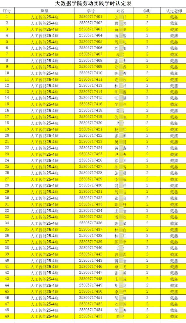 【劳动筑基 实践育人】第十周劳动实践纪实 秋意渐深,天朗气清。11月4日,大数据学院数据科学与大数据技术24-3班、数据科学与大数据技术24-4班和人工智能25-3班、人工智能25-4班的同学们,怀揣着对校园的热爱,分别奔赴指定区域,开展了一场有序且充实的校园清洁劳动实践活动,用双手为校园环境“焕新颜”。 活动开始前,各班结合清洁区域特点,提前做好分工安排:数科24-3班负责教工宿舍1号楼到东区10、11号学生宿舍楼周围的主干道与绿化带,数科24-4班则聚焦东区后门到风车处、北区到东区6号学生宿舍楼新建栈道及6号宿舍楼周围的主干道、栈道与绿化带。人工智能25-3班负责宿舍1号楼周边绿化带及主干道,人工智能25-4班负责校门口周边绿化带及主干道。明确的区域划分,让同学们一到现场便迅速进入状态。 手持垃圾夹、垃圾袋等工具,同们化身校园“美容师”,认真清扫每一处角落。主干道上,大家弯腰捡拾散落的纸屑、塑料瓶,确保路面干净整洁;绿化带中,有人细致清理隐藏在草丛里的烟头、杂物,避免垃圾污染土壤;新建栈道上,同学们更是格外用心,逐一擦拭栏杆、清理缝隙中的灰尘,让崭新的栈道始终保持清爽模样。劳动过程中,没有同学叫苦喊累,大家相互配合、彼此协助,遇到较重的枯枝落叶,便几人合力搬运,默契十足的身影成为校园里一道亮丽的风景线。 此次劳动实践,不仅让校园环境变得更加洁净雅致,更让同学们在亲身实践中体会到劳动的价值。看着自己清扫后的区域焕然一新,同学们脸上都洋溢着满满的成就感。大家纷纷表示,今后会更加珍惜校园环境,也愿意继续参与此类劳动活动,用实际行动守护校园的美好。 劳动虽短,意义绵长。同学们用汗水诠释了责任与担当,也为共建美丽校园注入了青春力量。相信这份劳动精神会持续传递,带动更多同学共同维护校园环境,让我们的校园始终焕发勃勃生机! d 附下周劳动实践安排 本周劳动实践学时认定表 大数据学院办公室 2025年11月8日