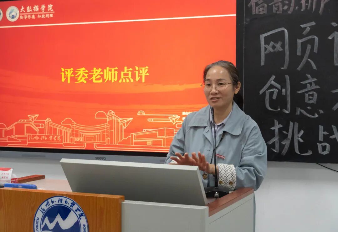 在本次大数据学院第二届数智文化节之“福韵新声·智绘福城”网页设计创意表达挑战赛的点评环节中,陈章斌老师对同学们作品彰显的创新探索精神予以高度认可。老师指出参赛作品基础扎实,但静态呈现为主的表现形式仍有优化空间,勉励大家深耕动态化、交互化设计,并着重强调,需强化理论与实践转化效能。