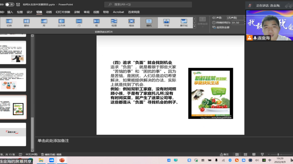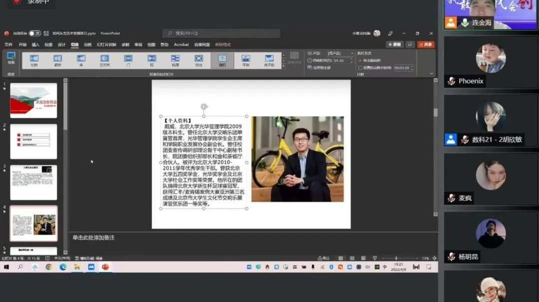 【我有我young】创新创业系列——第2期:如何从生活中发现项目 创新是一个民族进步的灵魂,是一个国家兴旺发达的不竭动力。在这样一个大众创业万众创新的时代,为了帮助同学们强化创新创业实践引领,为了解决同学们寻找项目的迷茫,帮助同学们激发想象力发掘身边的项目。我院于4月9日晚19:00,在腾讯会议举办创新创业分享会。本次分享会的嘉宾为19数据科学与大数据技术1班中共预备党员连金海同学。 连金海同学先是以项目南“馒”入侵为例,带领大家一起分析生活中的项目从何而来,紧接着陆续引入大学生创业案例、当前的创业环境、如何识别创业机会以及寻找项目需要,与时俱进紧跟政策来激发同学们的创新创业思维。 连金海同学也根据自身的参赛经验告诉同学们不要被思想束缚,大学生应该要主动投身到创新创业热潮中,敢于创新、勇于创新,把责任、勇气、方法、态度和精神融入到创新实践中。要在创新创业中增长智慧才干,在艰苦奋斗中锤炼意志品质,运用创业思维规划多彩绽放的人生。在创新创业的过程中,不要害怕失败,我们要在不断尝试,不断摔跤的过程中不断成长。 SHARE 书山有路,学海无涯 经验分享,助益成长 此次分享会激发了同学们参与创新创业比赛的热情,创新创业是时代的主旋律,大学生是创新创业的主力军,大数据学院将继续发扬创新创业精神,努力成为新时代高质量的大数据人。 但有了项目没有队友怎么办? 所以请期待下期的创新创业分享会! 下期将帮助同学们解决如何组队的困惑。
