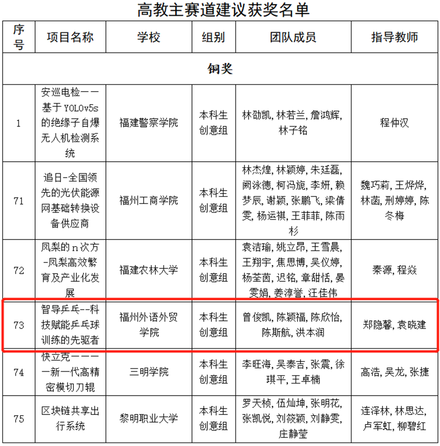 近日,在福建省教育厅公布的关于第八届福建省“互联网+”大学生创新创业比赛获奖名单中,我院《智导乒乓--科技赋能乒乓球训练的先驱者》(成员:曾俊凯、陈颖福、陈欣怡、陈斯航、洪本润,指导老师:郑隐馨、袁晓建)项目团队,结合专业知识技能,联动电子商务,计算机网络技术等各专业学生所长,在高教主赛道创意组赛道中,经过激烈的角逐,最终获得省赛铜奖。