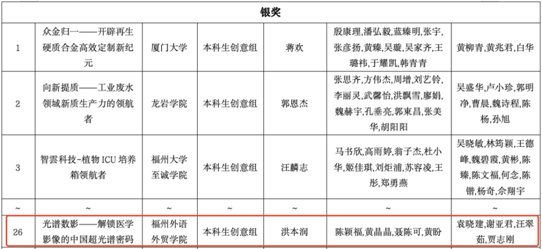 日前,福建省教育厅公布了第十届“中国国际大学生创新大赛”获奖名单。我院《光谱数影——解锁医学影像的中国超光谱密码》项目荣获银奖。