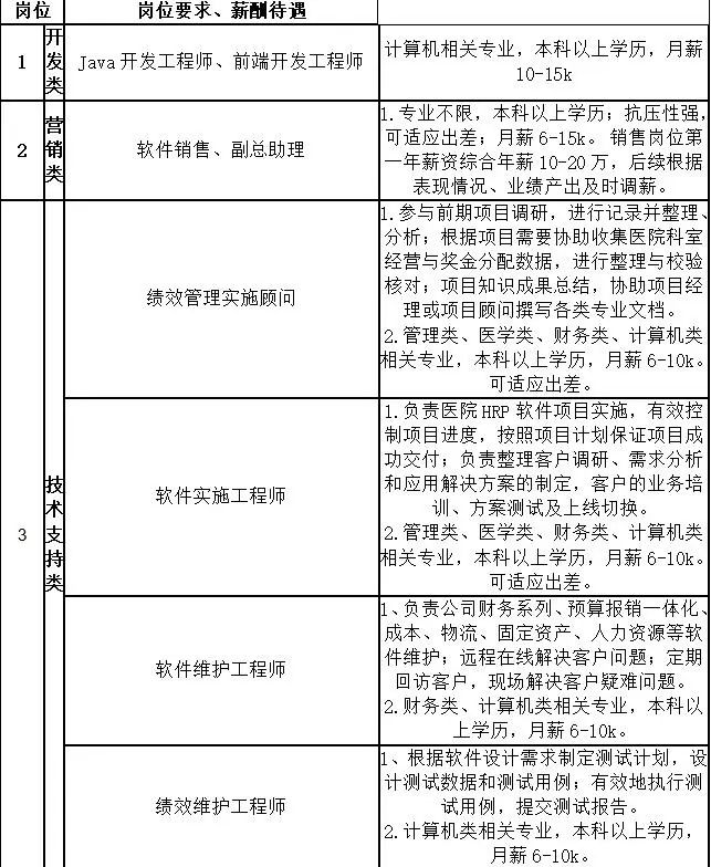 【就业指南】福建亿能达信息技术股份有限公司 2023校园招聘简章 公司简介 福建亿能达信息技术股份有限公司于2000年在福州注册成立,是国家首批从事医疗信息化服务的企业之一。公司现有员工近400人,主营业务覆盖医院运营管理系统(HRP)、县域医共体管理平台和互联网+健康管理平台等核心软件产品。成立至今,秉承着“专注医疗、助力医改、服务民生”的使命,公司已服务医疗卫生机构用户2000余家,其中包括1500多家医疗卫生机构,近百家三级院及200多家二级医院,实现福建省市场占有率95%,经营规模位居全国行业前五。公司现已成为福州软件园产业基地的骨干企业之一,在医疗卫生行业管理软件开发、系统集成方面具有雄厚的实力。公司获得包括高新技术企业、专家工作站、软件企业、ISO9001/14001/45001/20000/2700 1认证、CMMI5认证、福建省科技型企业、福建省科技小巨人领军企业等荣誉资质。公司深度参与“三明医改”,推出全国首创的工分制绩效考核模式,协助三明市尤溪县总医院实现“工分制绩效考核”方案落地,成果被列入国务院深化医药卫生体制改革典型案例,国务院副总理孙春兰曾多次调研三明市尤溪县总医院,并大力推广三明医改模式。借此,公司成功在全28个省级行政单位落地医疗信息化项目,协推国家医改进程,助力健康中国战略实施。 公司福利 公司提供具有市场竞争力的薪资,六险一金,周末双休,7.5小时弹性工作制,法定节假日,超长春节假期,年终奖金,满勤奖金,过节费,午餐补贴,生日福利,结婚礼金、生子礼金等各类礼金及慰问金,不定期员工活动,体检,境内外旅游,没有加班文化。 招聘岗位 联系方式 1.地址:福州市铜盘路软件大道89号软件园A区28号楼2F 2.网址:http://www.strongsoft.com.cn/ 3.联系人: 林女士:17704624982 汪先生:16624620871 (加微信请备注姓名+学校+意向岗位) 4.电话:0591-87882516-862 5.简历投递邮箱: ecan-hr@strongsoft.com.cn (姓名+学校+专业+岗位) 提醒:用人单位招聘人才,以任何名义向应聘者收取费用都属于违法(如体检费、培训费等),请广大学生提高警惕!举报邮箱:zp22866660@163.com 大数据办公室 2022年11月4日