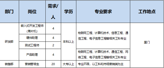【就业指南】2023届福建省四信数字科技集团有限公司校园招聘简章 一、公司简介 福建省四信数字科技集团有限公司,中国物联网无线通信产品与解决方案领先者,物联网云平台提供商。是一家以浓厚的“诚信、信任、信心、信仰”价值观色彩覆盖产品、服务和管理活动的高新技术企业、软件企业。荣获“福建省著名商标”与“厦门市著名商标”认证。3大核心业务。四信成立于2008年,公司总部设立于厦门经济特区。公司下设无线通信事业部、智慧水利事业部、无线传感事业部,专注于物联网行业应用产品、工业领域高端无线通信传输设备的研发、生产、推广和服务。专业化经营特色,强大研发实力,公司具有较强的研发实力,研发人员占公司总员工比例达60%以上,骨干研发人员在业内具有10年以上的研发经验。长期以来,四信紧贴物联网行业发展的脉搏,做行业发展的推动者;自主创新,做完全知识产权的实践者;深入物联网行业应用,为客户提供领先、专业的产品与服务;逐步形成了以产品为基础,为各行业客户提供系统解决方案的专业化经营特色,全面协助客户实现“智慧、标准、安全、可靠”的应用目标。 二、招聘岗位 三、薪资福利 1、六险一金; 2、工作时间—— 5天8小时工作制,周末双休; 3、广阔的发展平台 —— 良好的晋升空间,系统的培训体制及职业发展规划指导; 4、推荐员工奖励; 5、带薪休假,享受法定节假日、婚假、病假、年假、高温补贴、节日福利等相关带薪假期-拿走吧,不用谢; 6、年终评优; 7、重大节日过节费,节假日福利和生日会,慰问,慰唁,结婚,生育等各种礼金; 8、Nice的企业文化,人性化年轻化工作氛围,年轻的团队,良好的团队氛围、融洽的同事关系,相亲相爱的大家庭; 9、高新技术企业,可签订就业协议接收档案、协助落户办理、保障房购买、专利辅助申请、享受人才补贴等多项福利政策; 10、咖啡和零食享用、健身运动、工会活动、跨部门企业文化活动、开放自由的办公环境等。 四、联系方式 1、简历邮箱投递: laibinbin@four-faith.com,邮件主题命名:职位+院校+专业+姓名 2、公司地址: 厦门市集美区软件园三期B14栋5层 3、公司官网: www.four-faith.com.cn 4、更多企业资讯,关注企业微信公众号,“码”上了解 校招联系人: 大数据学院办公室 2022年11月21日