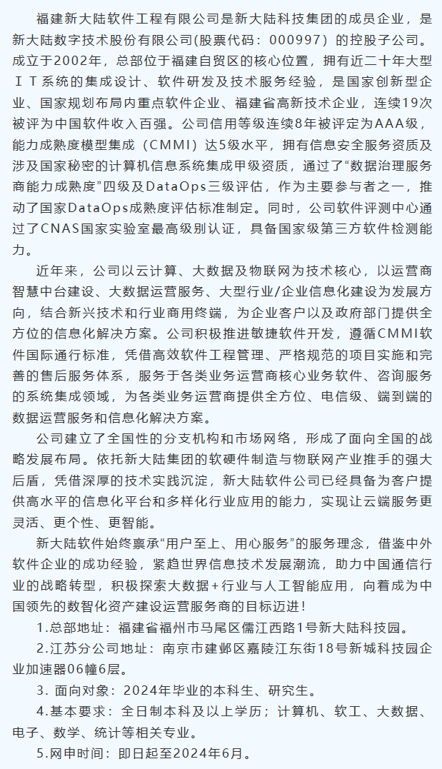【就业指南】福建新大陆软件工程有限公司 01 公司简介 02 招聘岗位 01 软件开发工程师 (JAVA) 工作地点:福州、南京、北京、银川、海口 02 数据开发工程师 工作地点:福州、南京、成都、银川、乌鲁木齐 03 数据分析工程师 工作地点:南京 04 软件测试工程师 工作地点:福州、南京、北京 05 软件开发工程师(WEB) 工作地点:南京 06 产品管理工程师 工作地点:福州、南京、成都、沈阳 07 需求分析工程师 工作地点:福州 08 质量管理工程师 工作地点:南京 09 应用运维工程师 工作地点:福州、南京、北京 10 系统运维工程师 工作地点:北京 11 系统集成工程师 工作地点:福州 03 福利待遇 大牛零距离、免费班车、免费健身房、花样俱乐部、六险一金、团建活动、年度体检、工科补贴、双一流补贴等 04 工作地点 福州、南京、北京、海口、乌鲁木齐、沈阳、成都、银川。 05 流程 网申-笔试-初试-复试-体检-录用-签约-实习-毕业报到 06 投递方式 1、邮箱投递:请将详细个人简历、相关证书等资料发送邮件至soft-yjs@newland.com.cn (邮件名请按“学校、姓名、毕业时间、应聘岗位”格式书写。) 2、校招热线:0591-83979678(福州)、025-68599386(南京) 3、2024届QQ交流群:745070282 4、公司官网:www.nlsoft.com.cn 大数据学院办公室 2023年10月24日