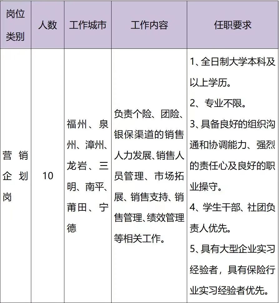【就业指南】新华人寿保险股份有限公司福建分公司2024校园招聘 公司简介 新华保险(A股代码 601336,H股代码 01336)成立于1996年9月,总部位于北京市,是国有控股上市公司、中投直管企业、世界500强企业之一。新华保险福建分公司成立于2002年5月,是新华保险在福建省(不含厦门市)设立的一家二级机构。 公司通过覆盖全国的销售和服务网络,共设立1700多家分支机构,投资保险类子公司3家,非保险类子公司10家,涵盖资产管理、养老、健康、物业管理、培训中心、后援中心、不动产建设等多个业务版块。2022年为3300多万名个人客户及8.3万名机构客户提供全面的寿险产品及服务,实现营业收入2,143亿元,总保费收入近1,630亿元,总资产超1.25万亿元。公司多措并举推动高质量发展,拥有资产管理、专业养老保险、健康管理、养老服务等子公司。 作为“双世界500强”企业,新华保险在2022年《财富》(Fortune)世界500强榜单中排名第416位,在《福布斯》(Forbes)全球上市公司2000强榜单排名第476位,并荣获 “全球最具价值保险品牌100强”“ 亚洲品牌500强”等多项荣誉,彰显了在经营管理、品牌建设、可持续发展等方面的综合实力。 校招岗位 上述招聘岗位均为内勤岗位。新华保险总公司及全国35家分公司招聘营销企划、培训讲师、数据分析、财务管理、人力资源、风险管理、法律合规、核保核赔、客户服务、信息技术、行政管理、品牌宣传、创意方案等岗位约800人,具体岗位详见网申平台或微信公众号。 校招对象 2024年7月31日前毕业的国内外高校应届毕业生,取得本科及以上学历和学位。 1.个人形象端正,品行良好,具有丰富校园活动或社会实践经验者优先; 2.较强的逻辑思维、沟通表达和组织协调能力,强烈的责任心和事业心; 3.有志于在金融或保险行业发展,愿意从专业岗位开始,不断学习积累和完善提升; 4.善于学习,乐于接纳新事物,勇于创新,敢于面对压力和挑战。 薪酬福利 1.薪酬:8-10万/年 2.福利:七险二金、带薪休假、带薪培训、定期体检、定制司服、员工活动、节日福利、生日慰问等。 校招流程安排 投递简历-笔试-面试-发放 offer-实习-体检-入职 网申、笔试:2023年10-12月 面试:2023年11-12月 录用通知:2023年12月-2024年2月 实习:2024年3-6月 体检、入职:2024年6-7月 简历投递方式 全国统一网申平台:nci.zhiye.com 微信申请:“新华保险人才招聘”微信公众号,即可在线申请。 联系人:林老师 电话:0591-28055109 邮箱:linhan@newchinalife.com 关于我们 1.世界500强企业平台:稳居寿险行业前列,坚持稳健经营,创新发展,已成为国内具有领先优势的寿险公司之一! 2.无忧的薪酬福利:福利保障完善,绩效不封顶,爱拼就会赢!各种福利、假期在向你招手~我们为你提供的,一定让你惊喜! 3.完善的培养计划:创新的员工培训体系和应届生培养计划,广阔的学习交流平台和深造机会让你放眼世界,轻松拥有大格局! 4.宽广的职业通道:从职场新人成长为行业专家、技术牛人、职业经理,这里的舞台足够宽广! 新华保险真诚期待你的加入! 大数据学院办公室 2023年11月1日