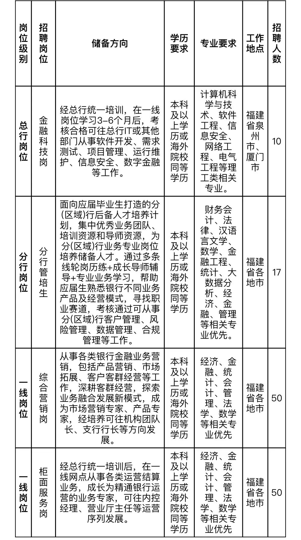 【就业指南】泉州银行股份有限公司2024校园招聘简章 一、企业简介 泉州银行成立于1997年6月,总行设于福建省泉州市,目前网点136家(含58家社区银行),实现福建省各地市全覆盖,形成以泉州为中心,福州、厦门为增长极,省内其他城市为支撑 的区域化发展格局。目前已启动上市筹备工作。 长期以来,泉州银行以“特色化、专业化的区域精品银行”为愿景,坚持城商行“三服务”定位,秉承“人本、诚信、创新、奋进”的核心价值观,倾力打造运营稳健、布局完善、专 业精深的商业银行。在全国范围内首创以无还本续贷为亮点的“无间贷”品牌,创新解决实体经济、中小微企业“融资难、融资贵、续贷难”问题,在全国产生广泛效应,连续多年上 榜英国《银行家》权威披露的“全球银行1000强”榜单、福建省纳税百强,近三年连续跻身福建服务业企业百强行列,品牌影响力稳步提升。 二、招聘岗位 01基本条件 (1)毕业时间:原则上境内高校应届毕业生应于2024年1月1日至2024年7月31日期间毕业,报到时应取得毕业证和学位证;境外院校应届毕业生应当在2023年8月1日至2024年7月31日期 间毕业,并在报到时提供国家教育部出具的学历(学位)认证。 (2)具备良好的心理素质及身体素质,具有较强的学习能力、沟通能力、团队意识和责任意识,具备良好的道德素养,无违规违纪违法等不良记录。 (3)符合监管要求亲属回避的有关规定。 (4)具体报名条件参照各岗位相关要求。 02岗位条件 03政策支持 根据党中央、国务院关于实施乡村振兴战略决策部署,以及人民银行、银保监会金融支持乡村振兴的相关政策,对满足以下任一条件的优秀贫困高校毕业生,同等条件下优先录用: ①持有户籍所在地民政局出具的城乡低保家庭证明; ②持有所在高校出具的已纳入贫困生库证明; ③获得国家励志奖学金或助学金; ④获得国家助学贷款。 04普惠金融客户经理(定向) (1)岗位职责 招录人员岗位定向为普惠金融客户经理,主要职责为:负责泉州银行普惠金融业务市场营销与拓展,对小微企业、个体工商户、一般自然人进行信贷调查、分析、评估与风控,开展普惠 金融信贷投放工作。 (2)岗位条件 ①统招本科(含)以上学历,条件优秀者可放宽至大专,2023届及2024届应届毕业生。 ②专业不限。 ③具备良好的心理素质及身体素质,具备较强的服务意识、团队意识、亲和力和沟通交流能力。 ④工作认真负责,具备较强的责任心、学习能力、拓展能力。 ⑤具备良好的道德素养,无违规违纪违法等不良记录。 (3)聘用形式 采用定向岗位、定向地点方式,岗位定向为普惠金融客户经理 三、报名方式及招聘流程 (一)报名方式 PC端:登录我行招聘门户 (http://boqzhaopin.zhiye.com/campus) 选择相应岗位进行报名。 移动端: ①关注“泉州银行人力资源在线”微信公众号→点击菜单栏“泉微招聘”→“2024校园招聘”完成在线投递。 ②扫描下方二维码快速投递简历 (二)招聘流程 网申→在线笔试→心理测评→多轮面试→体检→录用 (三)联系方式 官方网址:www.qzccbank.com 地址:泉州市丰泽区泉泰路266号 如有疑问可联系:周女士 联系电话:0595-22508226 邮箱:boq_zhaopin@163.com 四、其他说明 1. 应聘者应对申请资料和个人信息的真实性负责,并应如实注明个人奖惩记录,如有隐瞒或伪造,我行有权取消其录用资格。 2. 每位应聘者仅可报考一个岗位,请慎重选择。 3. 我行将通过招聘系统信息提示、手机短信及电子邮件等方式与应聘者联系,请确保您简历上的联系方式正确无误且保持通讯畅通。 4. 我行招聘不收取任何费用。 5. 如有其他问题欢迎扫描下方二维码关注官方微信平台“泉州银行人力资源在线”(微信号 boq_zhaopin)进行互动交流。 大数据学院办公室 2023年11月21日