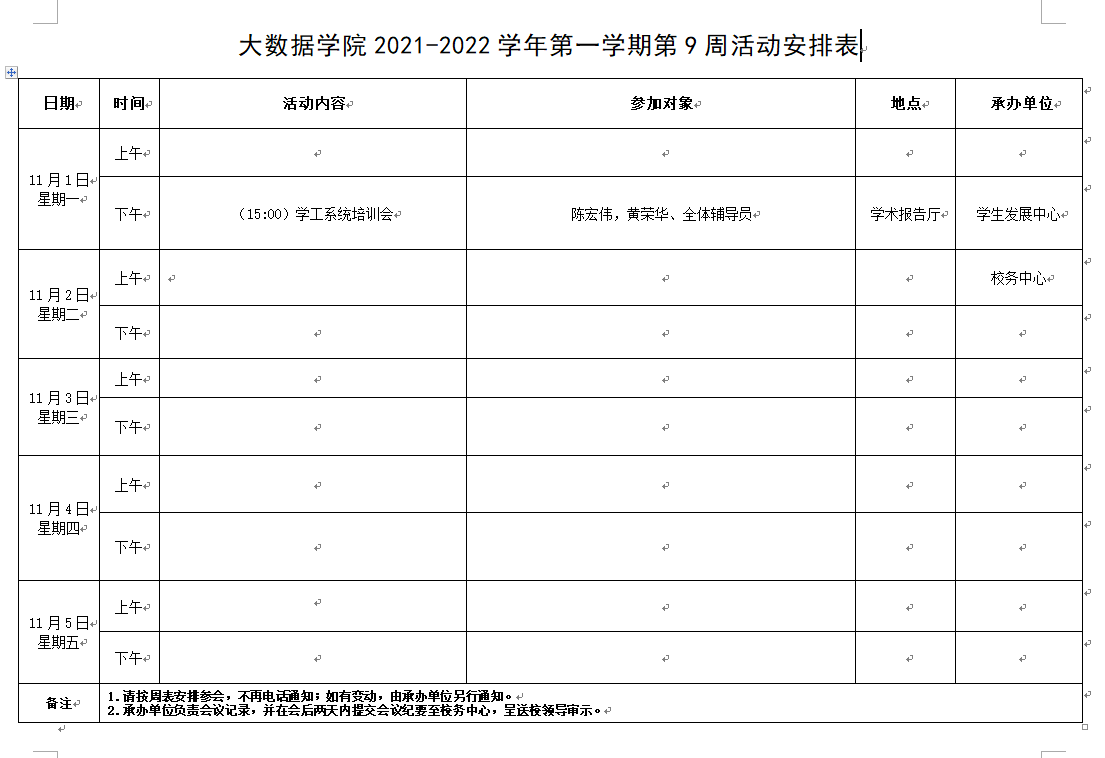大数据学院2021-2022学年第一学期第9周活动安排表