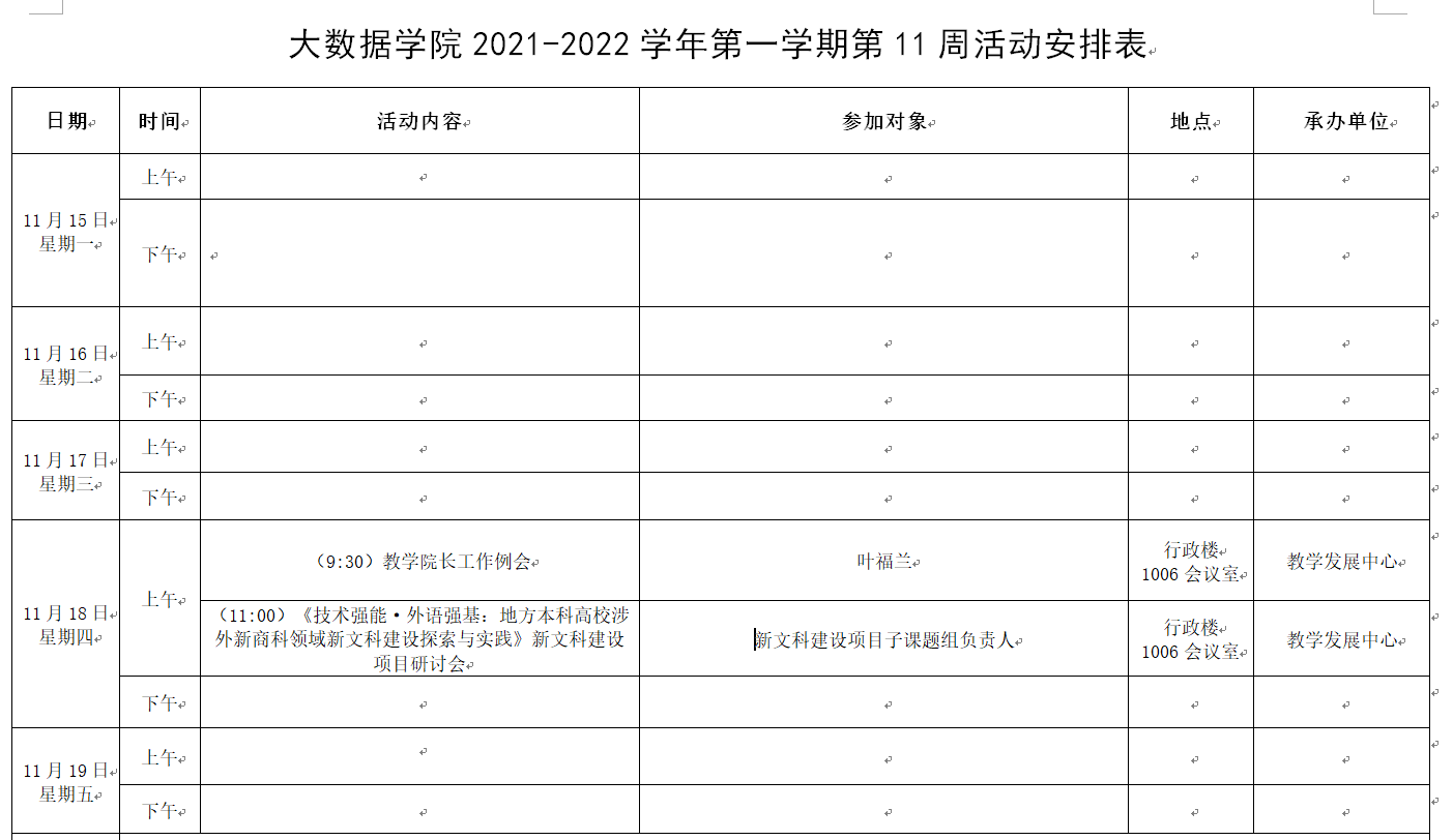 大数据学院2021-2022学年第一学期第11周活动安排表