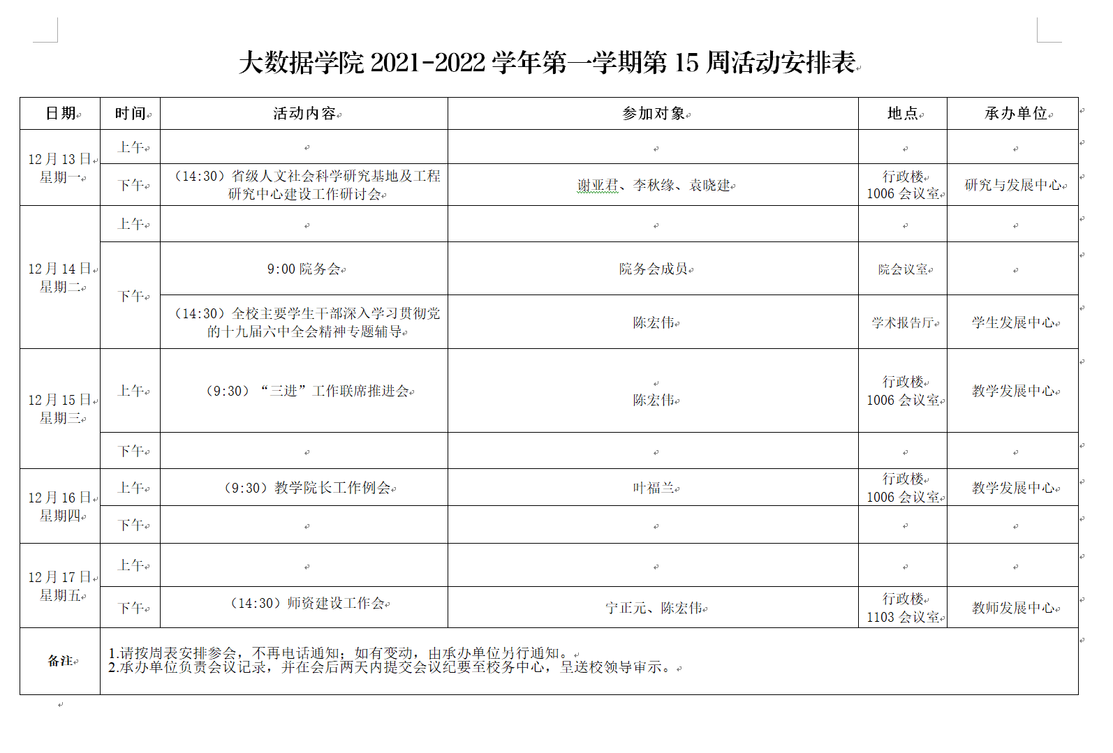 大数据学院2021-2022学年第一学期第15周活动安排表