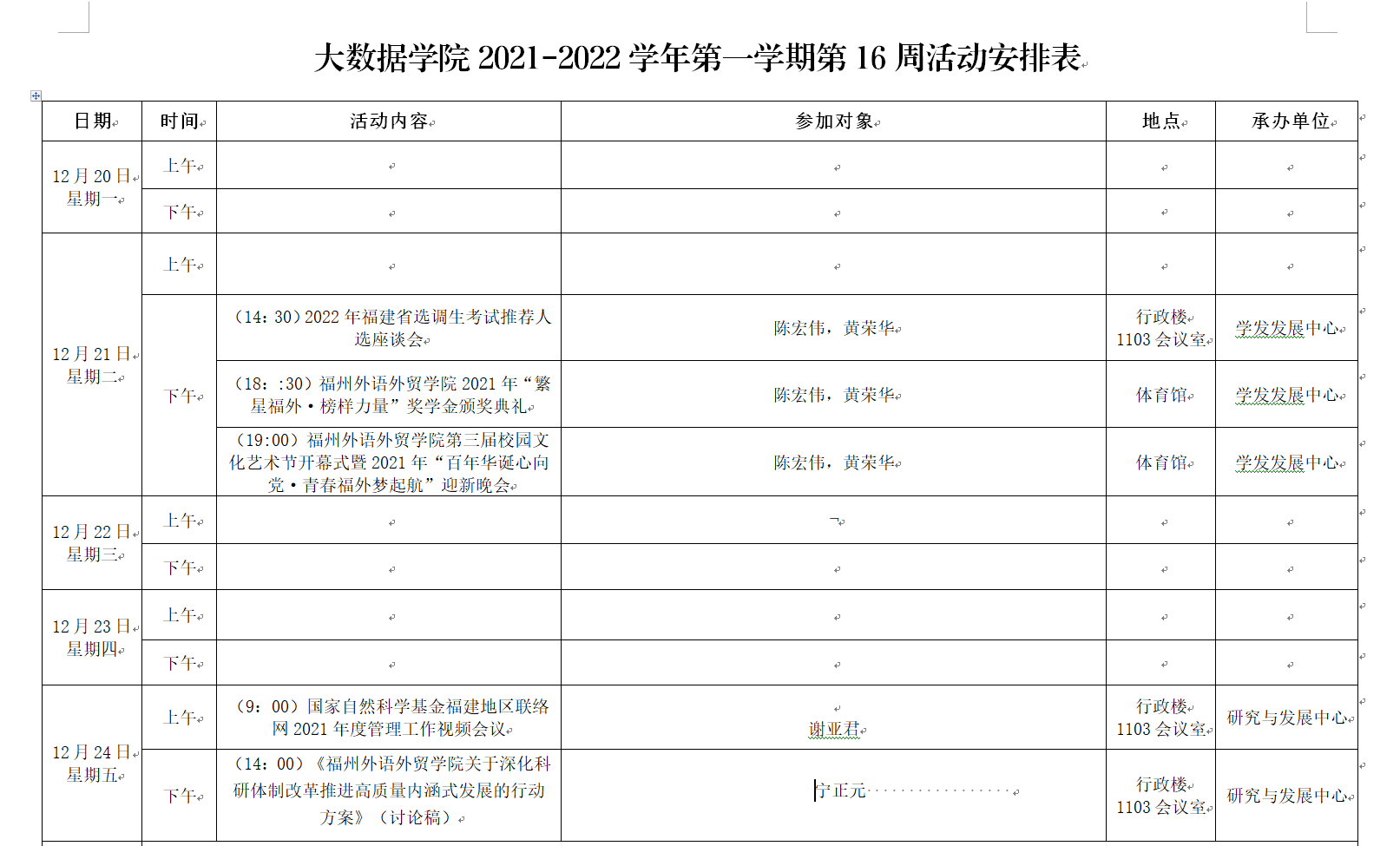 大数据学院2021-2022学年第一学期第16周活动安排表