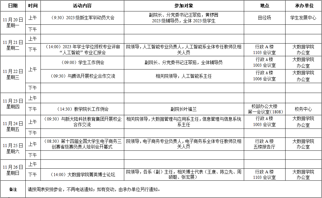 大数据学院2023-2024学年第一学期第12周活动安排表