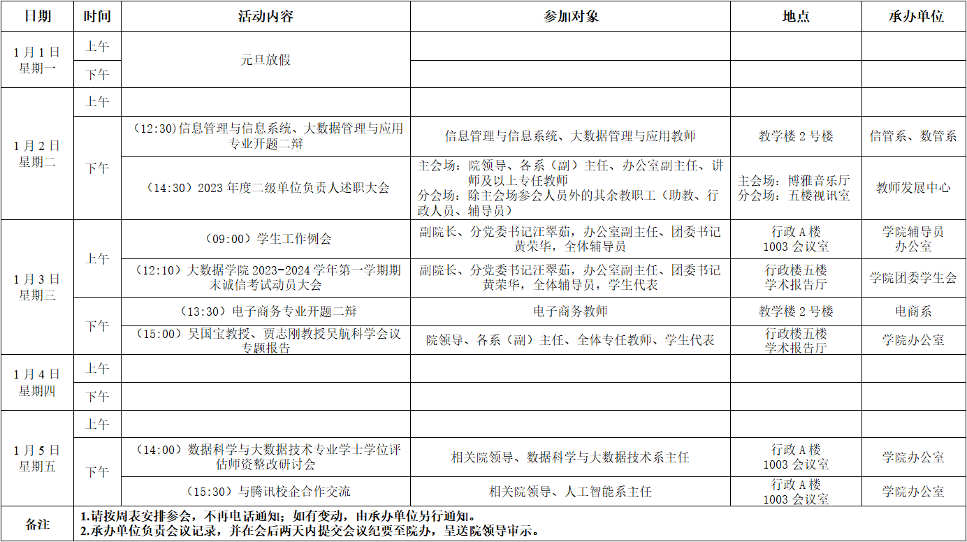 大数据学院2023-2024学年第一学期第18周活动安排表