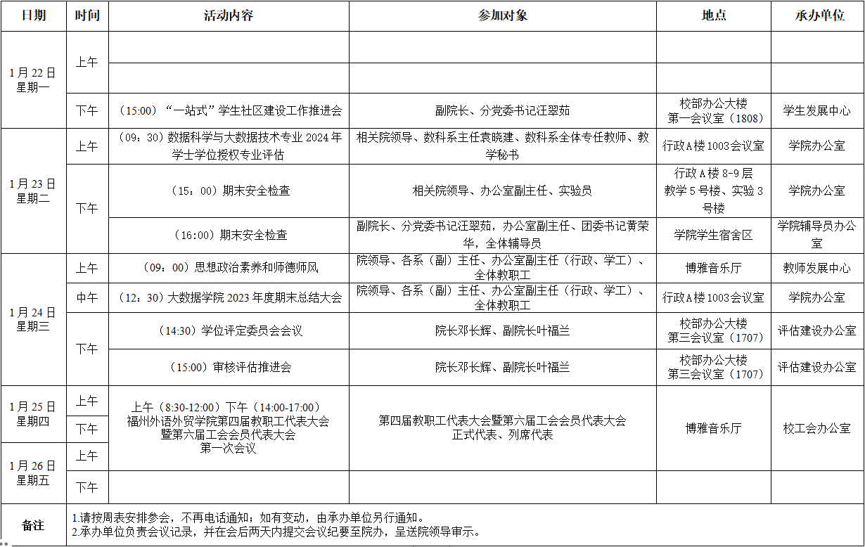 大数据学院2023-2024学年第一学期第21周活动安排表