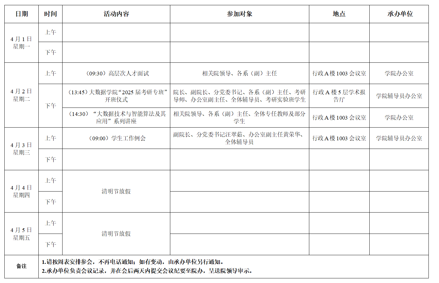 大数据学院2023-2024学年第二学期第6周活动安排表