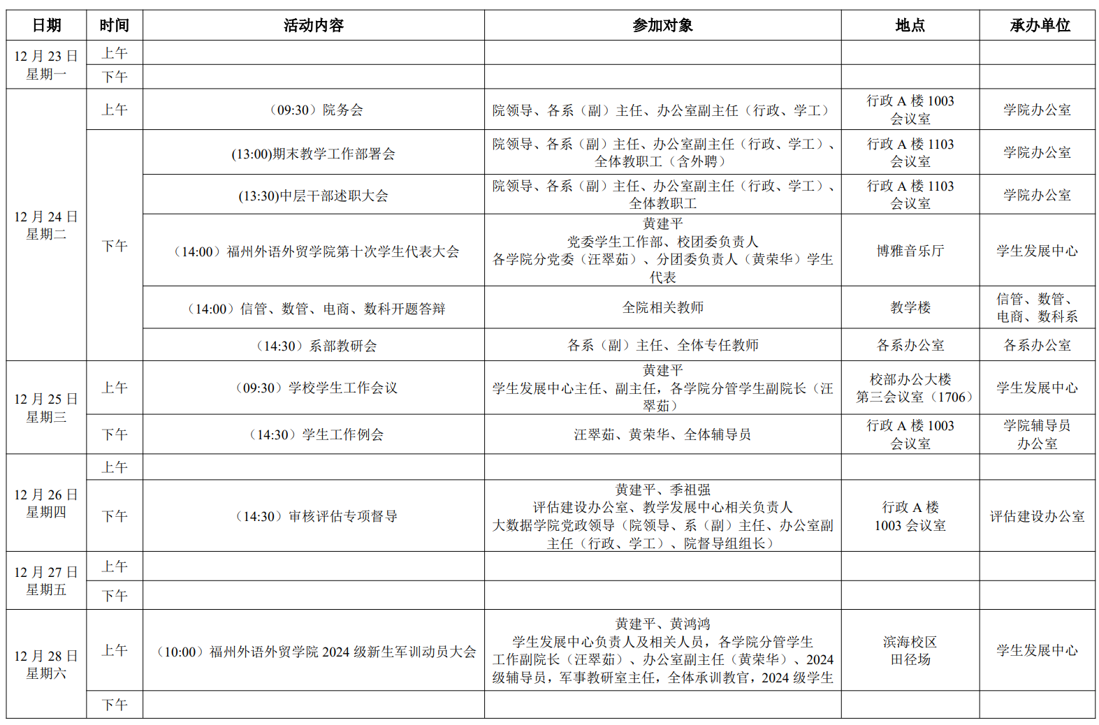 大数据学院 2024-2025 学年第一学期第 17 周活动安排表