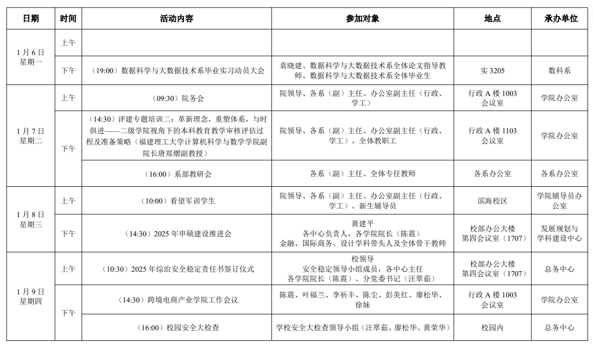 大数据学院 2024-2025 学年第一学期第 19 周活动安排表