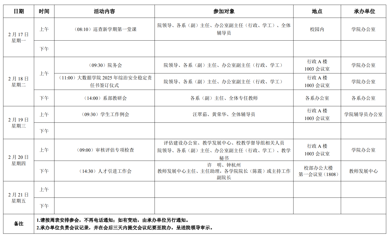大数据学院 2024-2025 学年第二学期第 1 周活动安排表