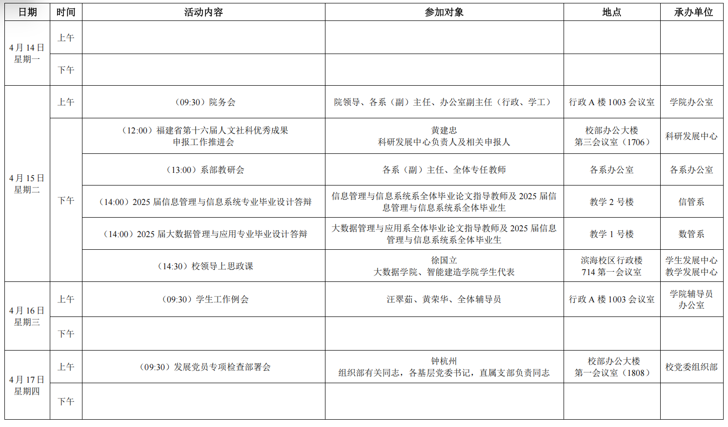 大数据学院办公室2024-2025学年第二学期第九周活动安排表