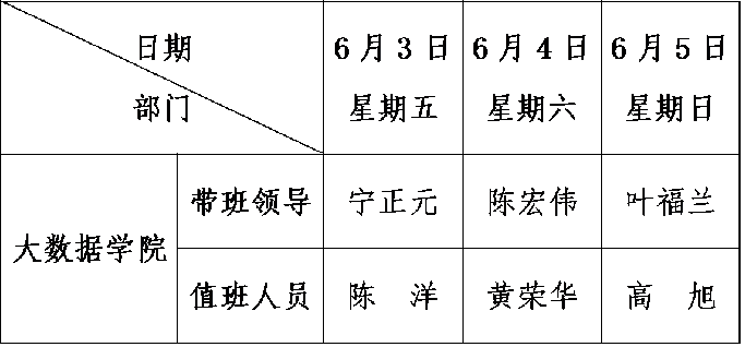 大数据学院2021-2022学年端午节值班安排表 备注: 1.所有值班人员应恪尽职守,保持警惕,不得擅自离岗。若遇突发情况须按我校既定相关预案处置并第一时间向带班领导报告。 2.值班人员必须保持24小时通信畅通,必须加强巡校和重点部位巡查,及时排查各种隐患。 3.24小时值班电话:18120891112。 4.学工系统值班表另附。 5.带班领导带班期间除外出检查值班工作或赴应急处突现场外,应在学校办公区履行带班职责,夜间(当日晚20时后)可在确保联络畅通的情况下居家带班。 大数据学院办公室 2022年6月1日