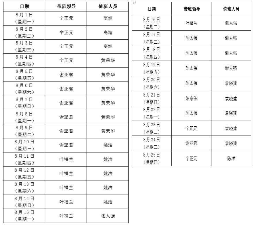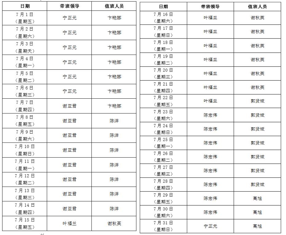 大数据学院2021-2022学年暑假值班表 备注: 1.所有值班人员应恪尽职守,保持警惕,不得擅自离岗。若遇突发情况须按我校既定相关预案处置并第一时间向带班领导报告。 2.值班人员必须保持24小时通信畅通,必须加强巡校和重点部位巡查,及时排查各种隐患。 3.24小时值班电话:18120891112。 4.学工系统值班表另附。 5.带班领导带班期间除外出检查值班工作或赴应急处突现场外,应在学校办公区履行带班职责,夜间(当日晚20时后)可在确保联络畅通的情况下居家带班。 大数据学院办公室 2022年6月30日