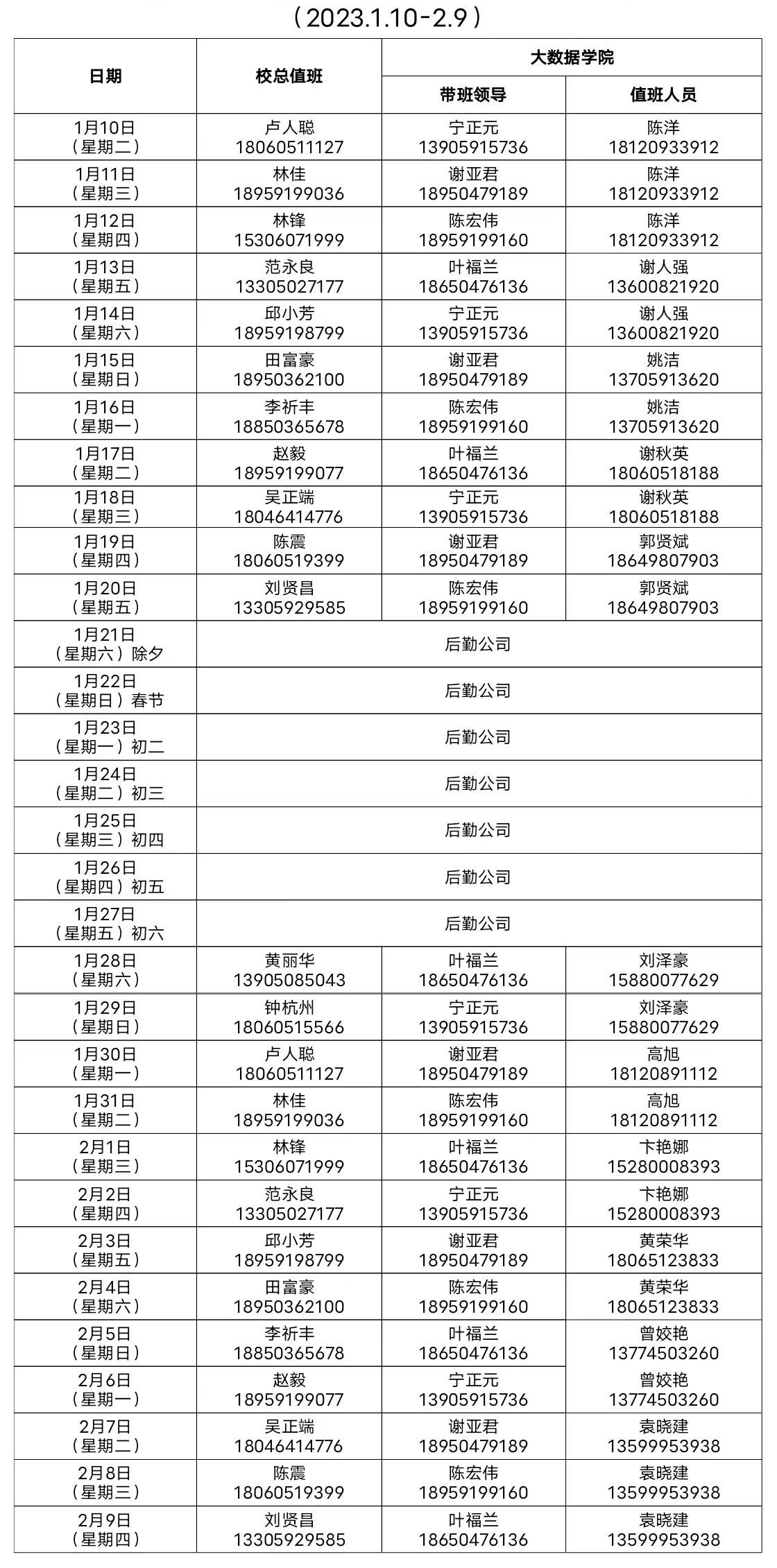 大数据学院2022-2023学年寒假值班表 备注:1.所有值班人员应恪尽职守,保持警惕,不得擅自离岗。若遇突发情况须按我校既定相关预案处置并第一时间向带班领导报告。2.值班人员必须保持24小时通信畅通,必须加强巡校和重点部位巡查,及时排查各种隐患。3.24小时值班电话18120891112。4.学工系统值班表另附。5.带班领导带班期间不离榕,保持手机24小时畅通。 大数据学院办公室 2023年1月9日