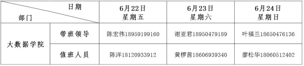 大数据学院2023年端午节值班安排表 备注:1.所有值班人员应恪尽职守,保持警惕,不得擅自离岗。若遇突发情况须按我校既定相关预案处置并第一时间向带班领导报告。2.值班人员必须保持24小时通信畅通,必须加强巡校和重点部位巡查,及时排查各种隐患。3.24小时值班电话18120891112。4.学工系统值班表另附。5.带班领导带班期间不离榕,保持手机24小时畅通。 大数据学院办公室 2023年6月21日