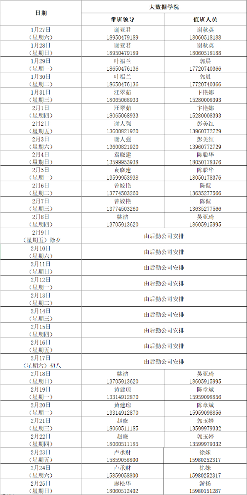 大数据学院2023-2024学年寒假值班表 备注:1.校总值班值班地点为国际街学校安全工作办公室应急指挥中心,每日值班时段为9:00—次日9:00,校总值班人员应到英特大厦1807向校务中心值班人员领取值班手机和值班登记本。2.校总值班须24小时在岗,对学校各单位值班情况进行巡察,并填写值班登记本,有突发情况要及时报告。3.校总值班人员请到北区招待所领取休息室(114房)钥匙,联系人杨阿姨:180590392684.所有值班人员应恪尽职守,保持警惕,不得擅自离岗。若遇突发情况须按我校既定相关预案处置并第一时间向带班领导报告。5.值班人员必须保持24小时通信畅通,必须加强巡校和重点部位巡查,及时排查各种隐患。6.24小时值班电话19305010110。7.学工系统值班表另附。8.带班领导带班期间除外出检查值班工作或赴应急处突现场外,应在学校办公区履行带班职责, 大数据学院办公室 2023年1月9日