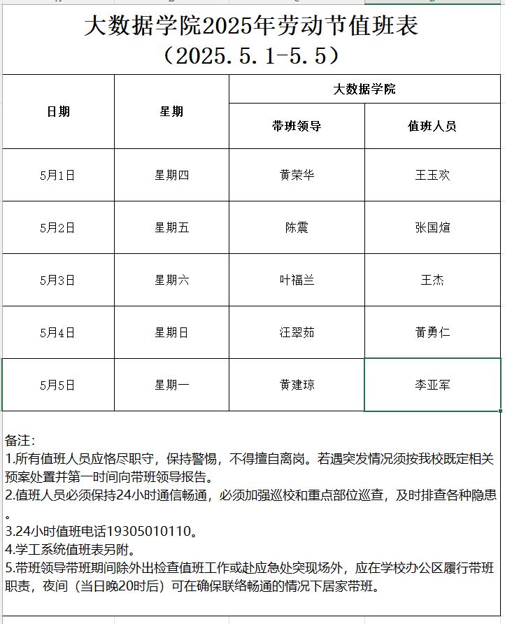 大数据学院2025年劳动节值班表