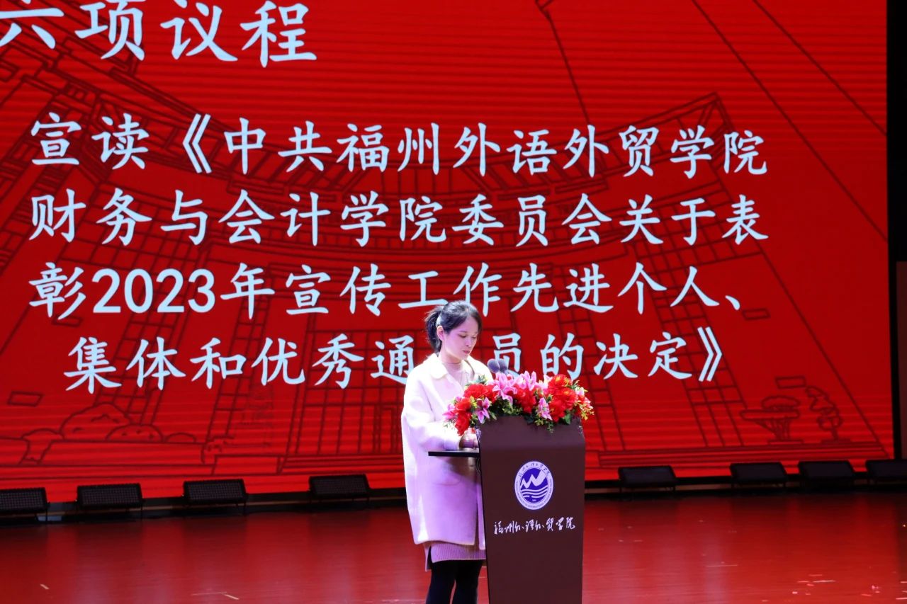 潘云燕宣读《中共开元网站登录入口财务与会计学院委员会关于表彰2023年宣传工作先进个人、集体和优秀通讯员的决定》