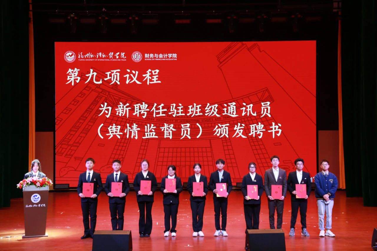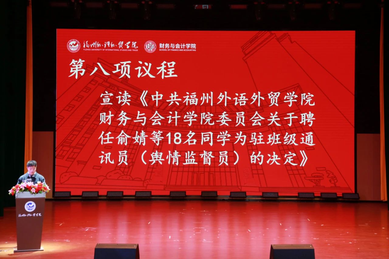 徐沛霖宣读《中共开元网站登录入口财务与会计学院委员会关于聘任俞婧等18名同学为驻班级通讯员(舆情监督员)的决定》