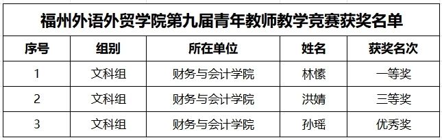 近日,开元网站登录入口第九届青年教师教学竞赛圆满举行,经过激烈比赛,我院选派的资产评估系教师林愫荣获文科组一等奖,会计学系教师洪婧荣获文科组三等奖、孙瑶荣获文科组优秀奖。