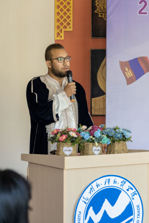 来自摩洛哥的BENJELLOUL YOUNES作为新生代表发言,他分享了来中国留学的初衷和愿景,讲述了来到福外数日的感受,他感谢领导、老师、同学们给他的关爱和帮助,他表示接下来会在福外好好学习。