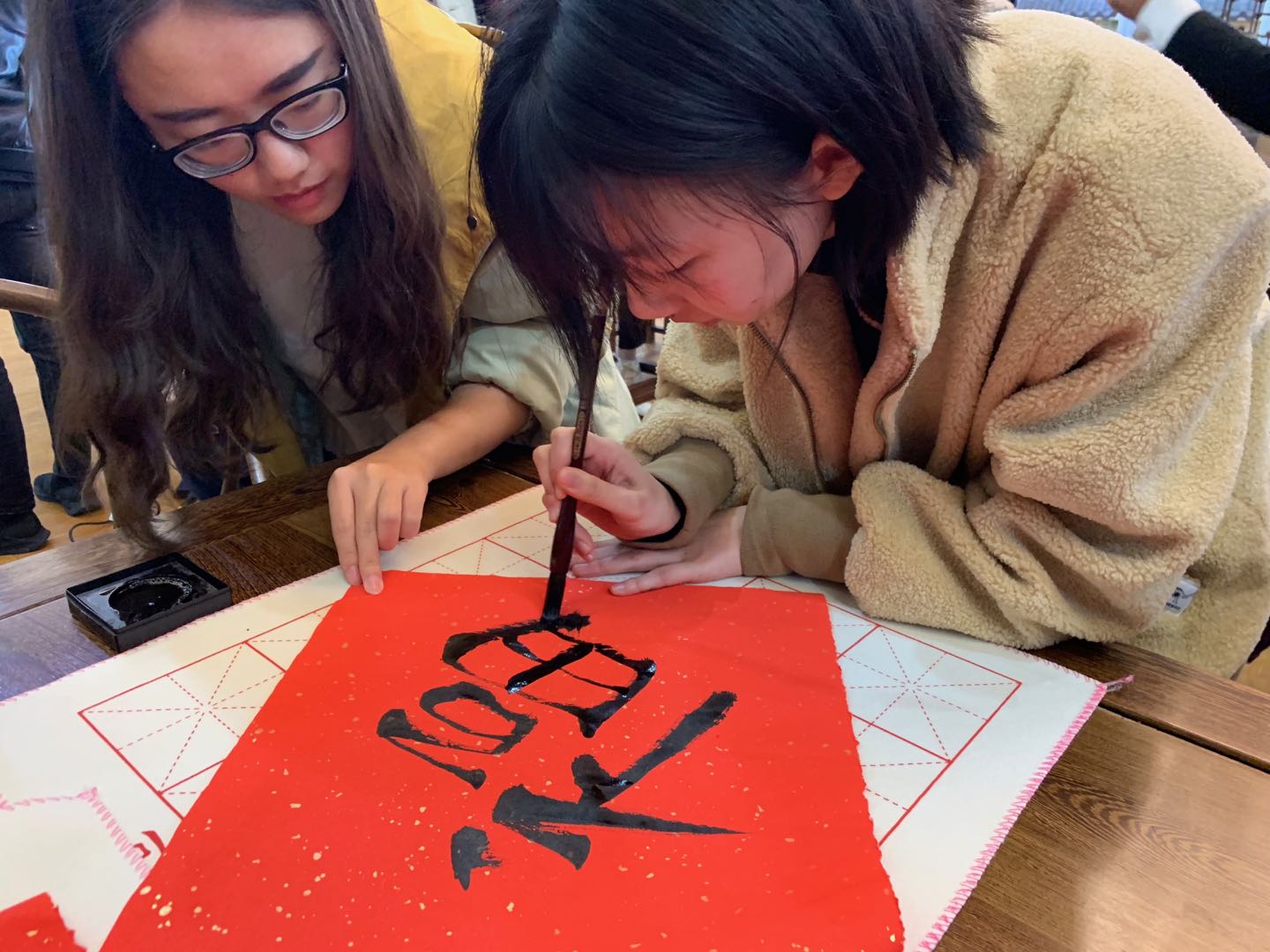 活动中,主持人向国际学生介绍了中国书法毛笔的起源,就新春字联书法,简述了其中蕴含的美好祝福与情谊。随后,书法协会成员展示了如何书写“福”字。在看完展示后,国际学生跃跃欲试,法协会成员耐心指导每一位国际学生汉字书写的执笔方法、点画、章法结构。