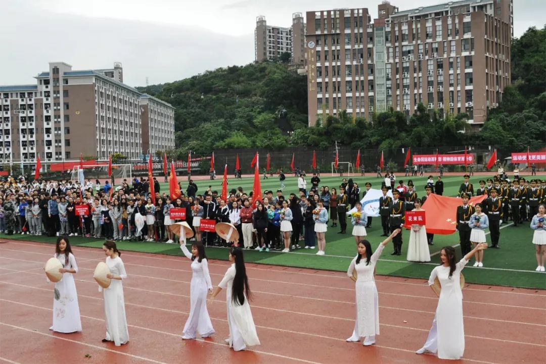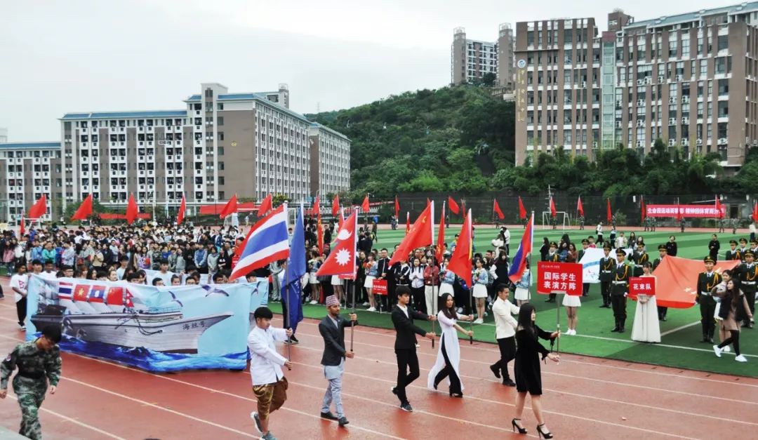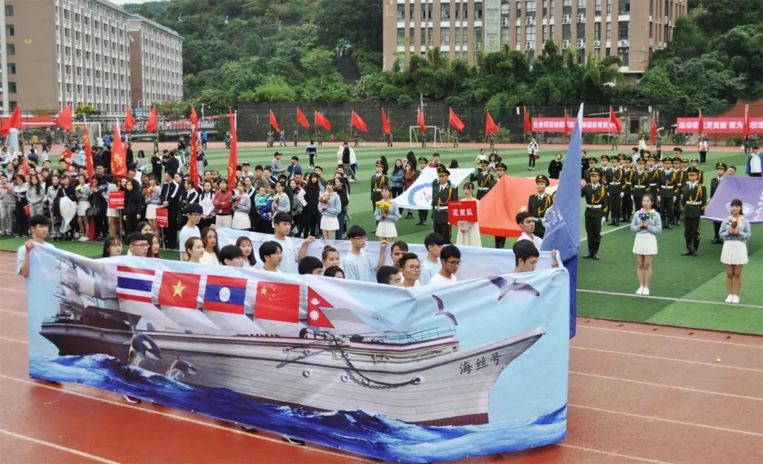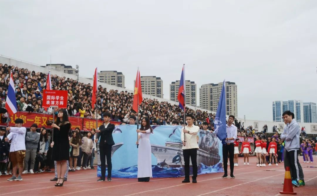 青山隐隐水迢迢,秋尽江南草未凋。2018年11月22日,我校第八届体育节暨第十三届校运动会开幕式在校田径场举行。伴随着昂扬的运动员进行曲,由海上丝绸之路沿线国家越南、泰国、老挝、尼泊尔留学生组成的国际学生代表队摆成船形方阵载歌载舞地走向主席台,他们用民族特色舞蹈为福外献上祝福。国际生所乘之船为”海丝”号,所演之意为“海丝之路通四海,溯游而上访中华”,寓意着沟通中外交流的友谊之船通过海上丝绸之路向福外驶来。