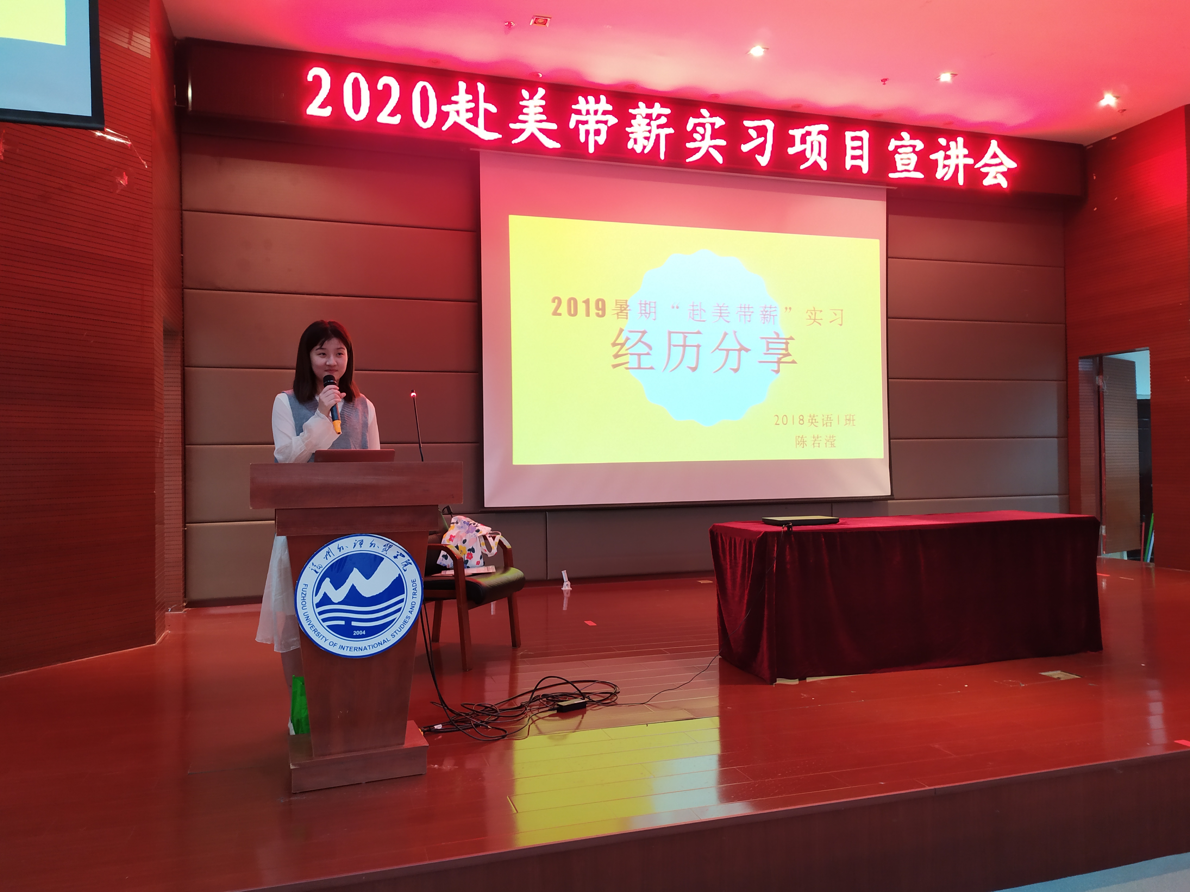 会上,项目方代表介绍了赴美带薪实习项目的背景及特点,并对报名流程及相关注意事项做了详细的说明。随后, 参加2019年赴美带薪实习项目的两位学员——2018级英语专业学生陈若滢、彭博就各自赴美期间的见闻、经历、成长及收获作了生动的分享,鼓励大家抓住机会,带薪体验美国文化。最后,项目方代表为上台分享的两位学员现场颁发了项目证书,表示肯定与鼓励。